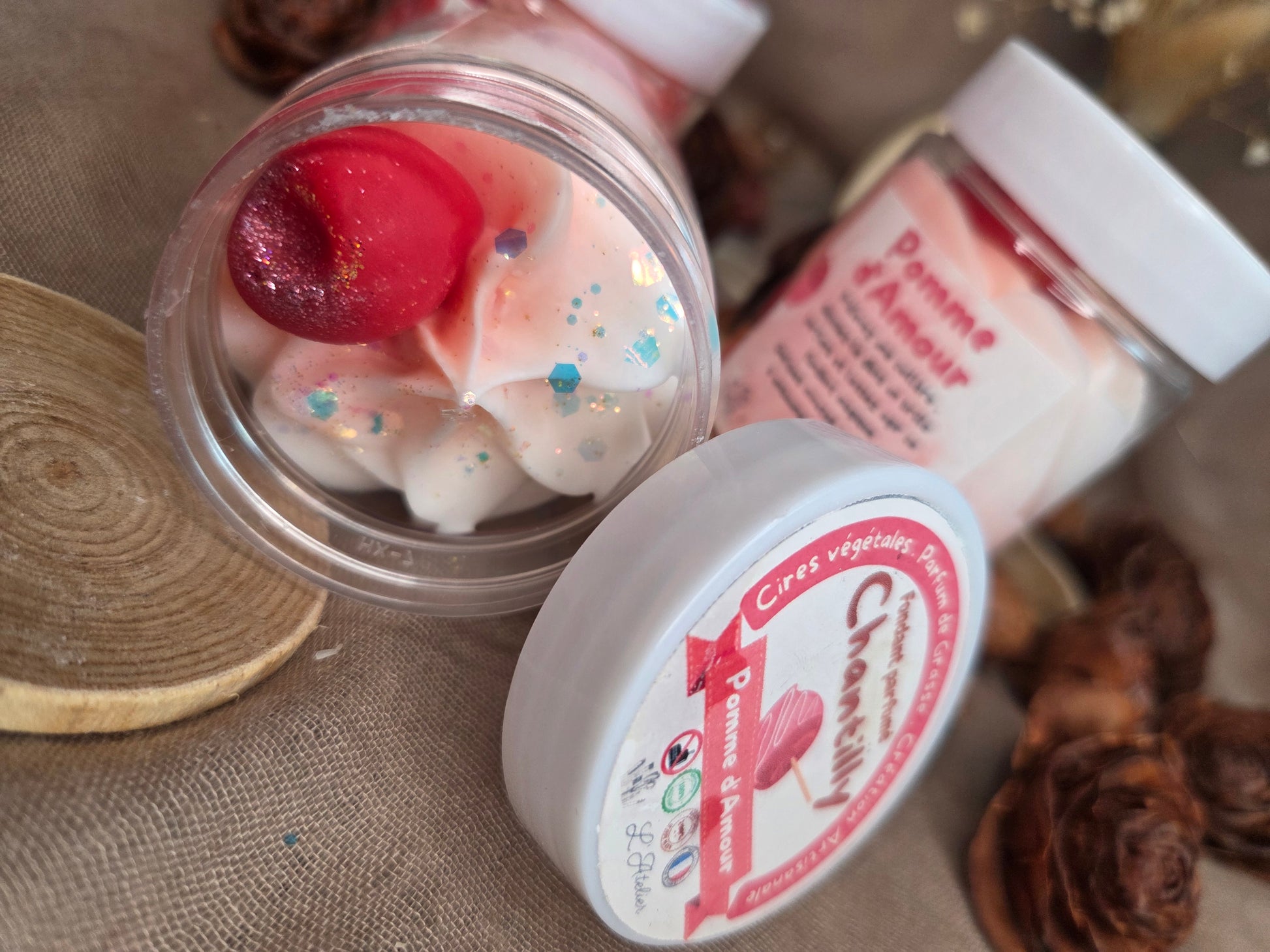 Nos fondants chantilly sont élaborés avec le plus grand soin, à partir de cire végétale (soja, coco et olive) issue de l'agriculture française raisonnée. Nos fragrances de Grasse sont garanties sans CMR (Cancérogènes, Mutagènes, Reprotoxiques) et sans phtalates, pour un produit aussi sain pour votre santé que joli à regarder !
